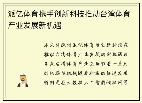 本文将探讨派亿体育与创新科技在推动台湾体育产业发展的新机遇。近年来,台湾体育产业正面临着一系列的机遇与挑战,随着科技的快速发展,特别是在大数据、人工智能、物联网等领域的应用,传统体育产业正发生着深刻变革。派亿体育作为行业的重要推动者之一,携手创新科技推动台湾体育产业的未来发展,不仅为台湾体育事业注入新的活力,也为全球体育产业带来了创新思维与解决方案。本文将从四个主要方面详细分析派亿体育如何通过技术创新和合作促进台湾体育产业的变革:一是体育科技的应用与发展,二是智能硬件和设备的创新,三是大数据和人工智能的助力,四是跨界合作和产业链的构建。通过这些探讨,我们将看到派亿体育在推动台湾体育产业现代化中的关键作用及未来的广阔前景。